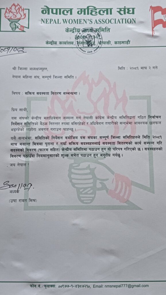 ‘निर्वाचन निर्देशक समितिको निर्देशन वमोजिम यस संघका सम्पूर्ण जिल्ला समितिहरूले मिति २०८१ माघ मसान्तभित्रमा पुराना र नयाँ सक्रिय सदस्यहरूलाई सदस्यता वितरणको कार्य सम्पन्न गरी सदस्यको विवरण (फारमसहित) केन्द्रीय समितिमा पठाउन हुन यो परिपत्र गरिएको छ । सदस्यहरूको विवरण पठाउँदा नियमानुसारको शुल्क समेत पठाउन हुन अनुरोध गर्दछु’, परिपत्रमा अध्यक्ष रावतले भनेकी छिन् ।
