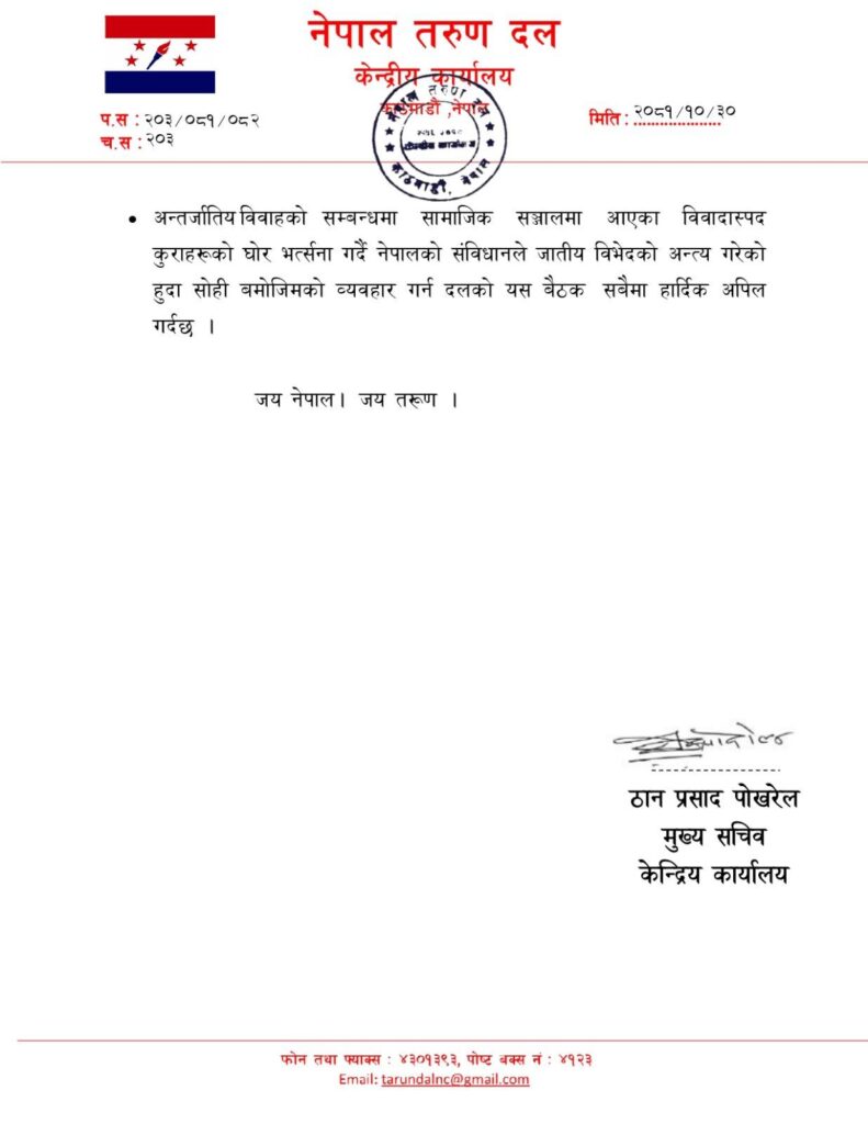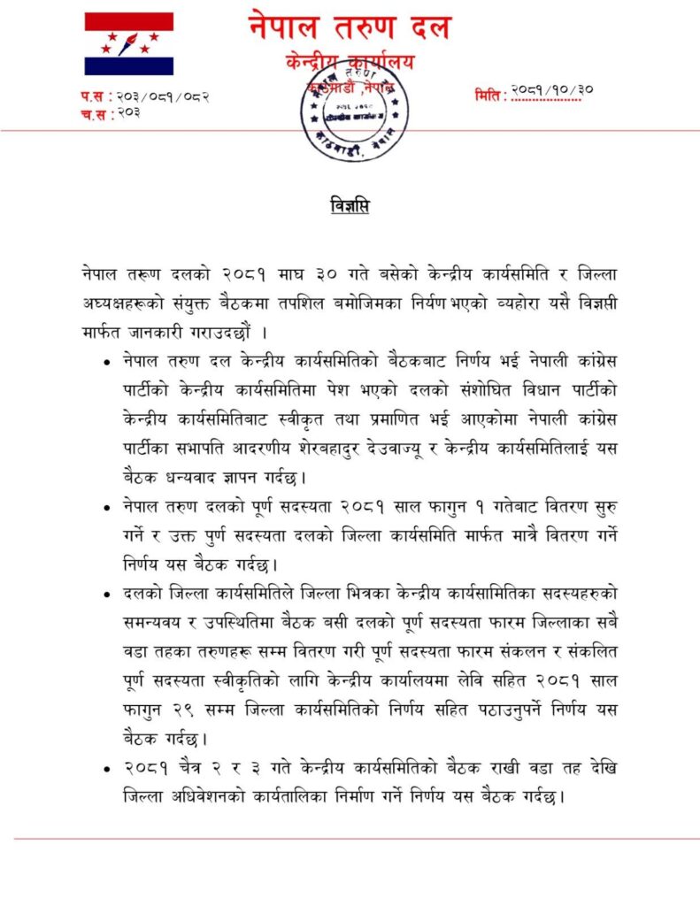 बुधबार वीपीनगर, ललितपुरस्थित नेपाली कांग्रेसको केन्द्रीय कार्यालयमा बसेको नेपाल तरुण दलको केन्द्रीय कार्यसमिति, जिल्ला अध्यक्षहरू र नेपाल तरुण दल ५औँ महाधिवेशन निर्देशन समितिको संयुक्त बैठकले तरुण दलको पूर्ण सदस्यता वितरण फागुन १ गतेदेखि गर्ने निर्णय गरेको हो ।
