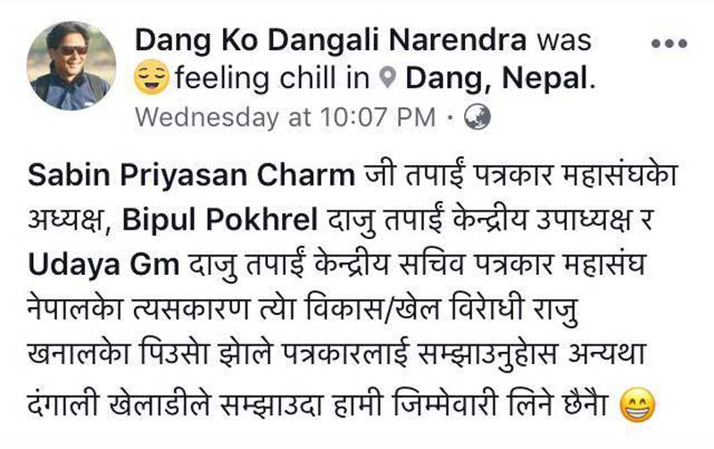 ‘सविन प्रियसनजी तपाई पत्रकार महासंघको अध्यक्ष, विपुल पोख्रेल दाजु तपाई केन्द्रीय उपाध्यक्ष र उदय जिएम दाजु तपाई केन्द्रीय सचिव पत्रकार महासंघ नेपालको त्यसकारण त्यो विकास र खेल विरोधी राजु खनालको पिउसो झोले पत्रकारलाई सम्झाउनुहोस् अन्यथा दङ्गाली खेलाडीले सम्झाउँदा हामीले जिम्मेवारी लिने छैनौँ’, भनेर धम्की दिएका छन् ।