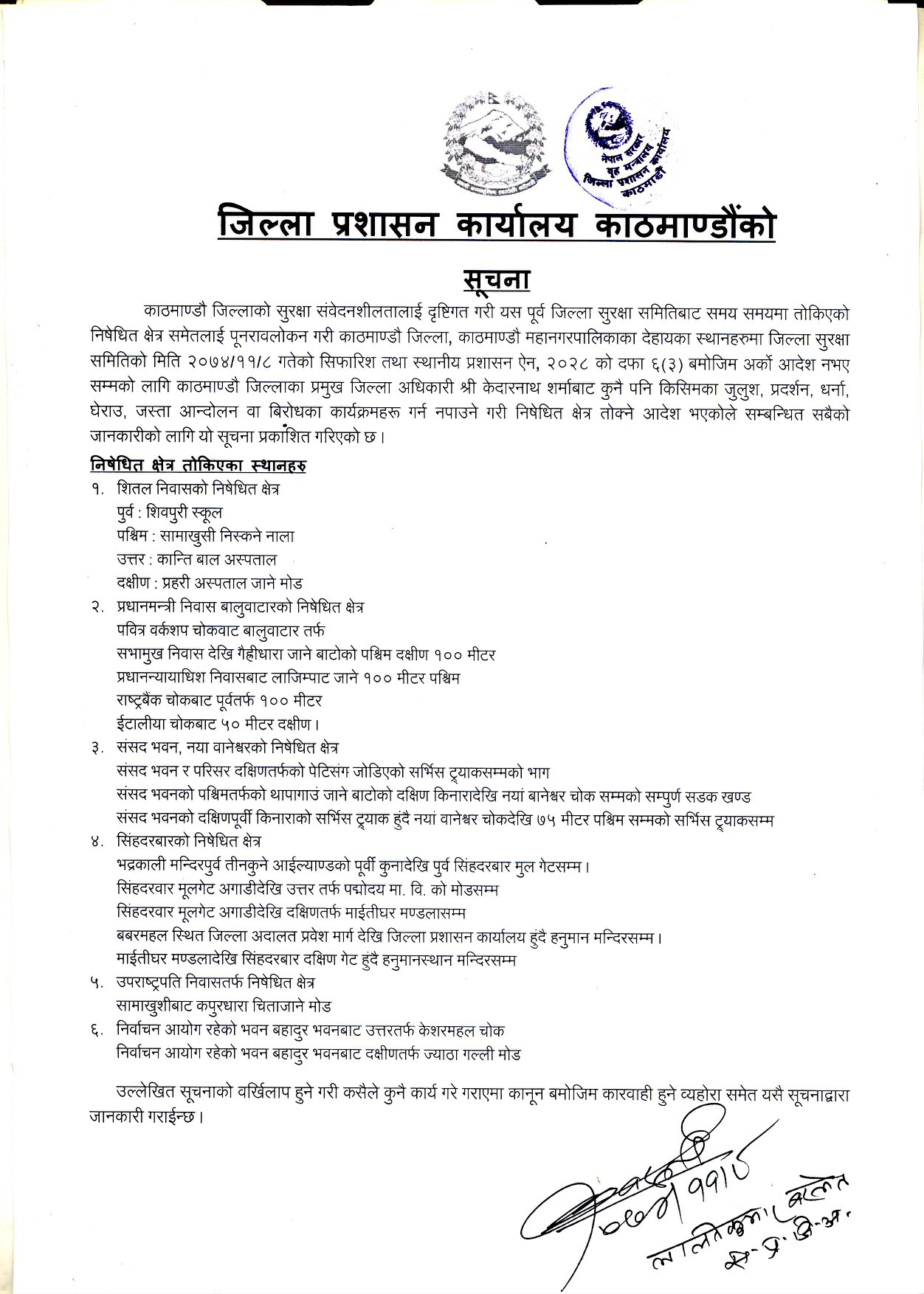 सूचनामा राष्ट्रपति कार्यालय शीतल निवास आसपासको क्षेत्रमा पनि प्रदर्शन गर्न नपाइने उल्लेख छ । संसद भवन, सिंहदरबार, उपराष्ट्रपतिको कार्यालय, निर्वाचन आयोगको कार्यालय लगायतका स्थानमा पनि स्थानीय प्रशासनले निषेधित क्षेत्र तोकेको छ ।