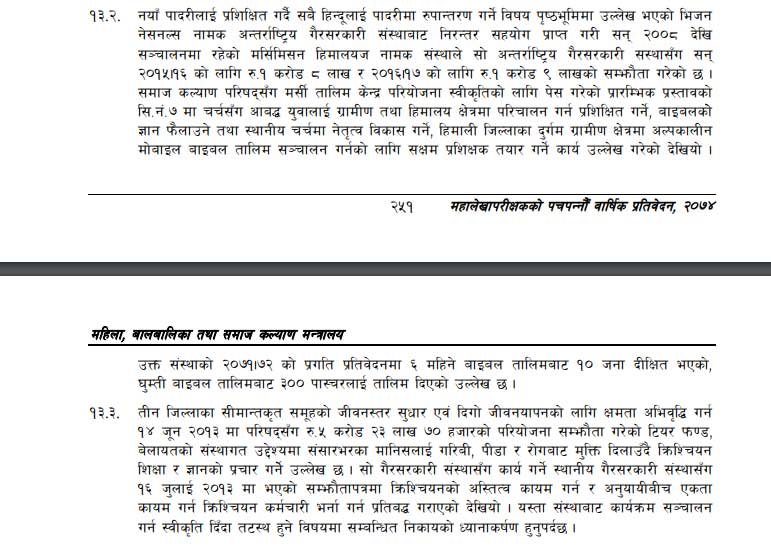 महालेखा परीक्षकको वार्षिक प्रतिवेदनको पेज नं. २५१ को सि.नं. १३.१ बुँदामा हिन्दूधर्म मान्नेहरूलाई क्रिश्चियनको पादरी बनाउन अन्तर्राष्ट्रिय गैरसरकारी संस्था ‘भिजन नेसनल्स’बाट ठूलो रकम लिएको उल्लेख छ ।