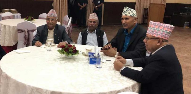 रात्रिकालीन भोजमा सरिक हुनुभन्दा केही समय अगाडि प्रधानमन्त्री एवम् अध्यक्ष ओली, वरिष्ठ नेता माधवकुमार नेपाल, महासचिव विष्णु पौडेल र बेदुराम भुसालले एउटै टेबुलमा बसेर चिया पिएका थिए ।