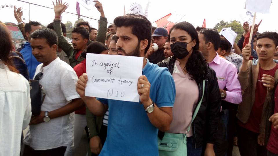 नेविसंघका कार्यकर्ताले प्रदर्शनीमार्गदेखि शंकरदेव क्याम्पससम्म प्रदर्शन गरेका थिए । उनीहरूले शान्ति सुरक्षा बनाउन नसक्ने कम्युनिस्ट सरकारको चर्को विरोध गरेका छन् ।