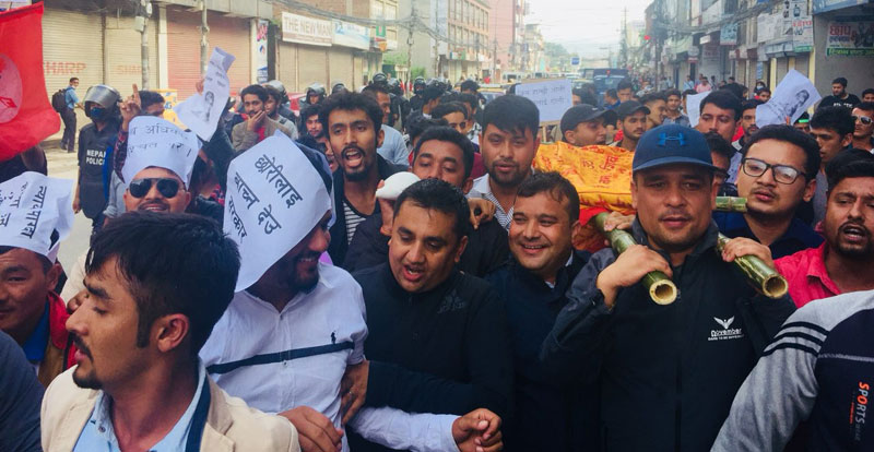 नेविसंघका कार्यकर्ताले प्रदर्शनीमार्गदेखि शंकरदेव क्याम्पससम्म प्रदर्शन गरेका थिए । उनीहरूले शान्ति सुरक्षा बनाउन नसक्ने कम्युनिस्ट सरकारको चर्को विरोध गरेका छन् ।