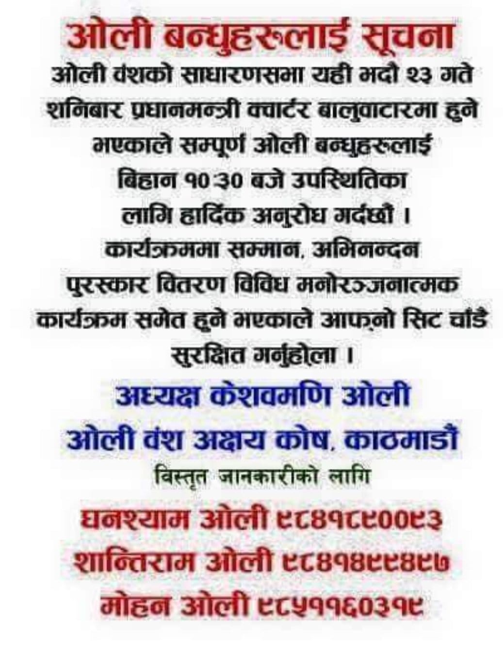नेपाल कम्युनिस्ट पार्टी (नेकपा)का अध्यक्ष समेत रहेका प्रधानमन्त्री ओलीले जातीय कार्यक्रम गर्नका लागि आफ्नो सरकारी निवासमा स्वीकृति दिएका छन् । भदौ २४ गते साढे दश बजे ओली वंश अक्षय कोषको साधारण सभा हुनेछ ।