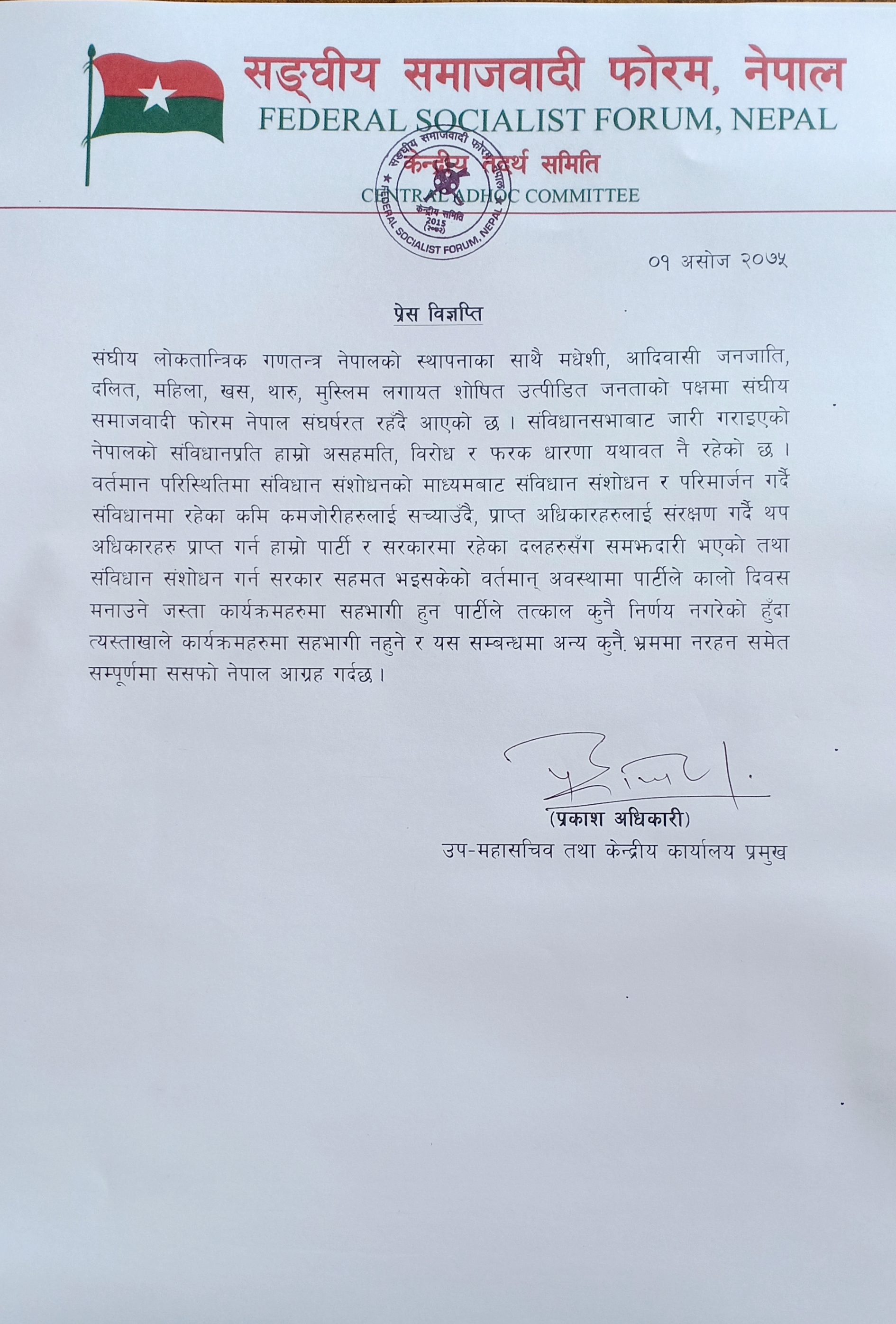 संघीय समाजवादी फोरम नेपालले सत्तामा बसेर संविधान दिवसविरुद्ध असोज ३ गते कालो दिवस मनाउन लागेको भनेर समाचार आइरहेका बेला संविधान दिवस विरुद्ध कुनै पनि कार्यक्रम नरहेको जनाएको हो ।