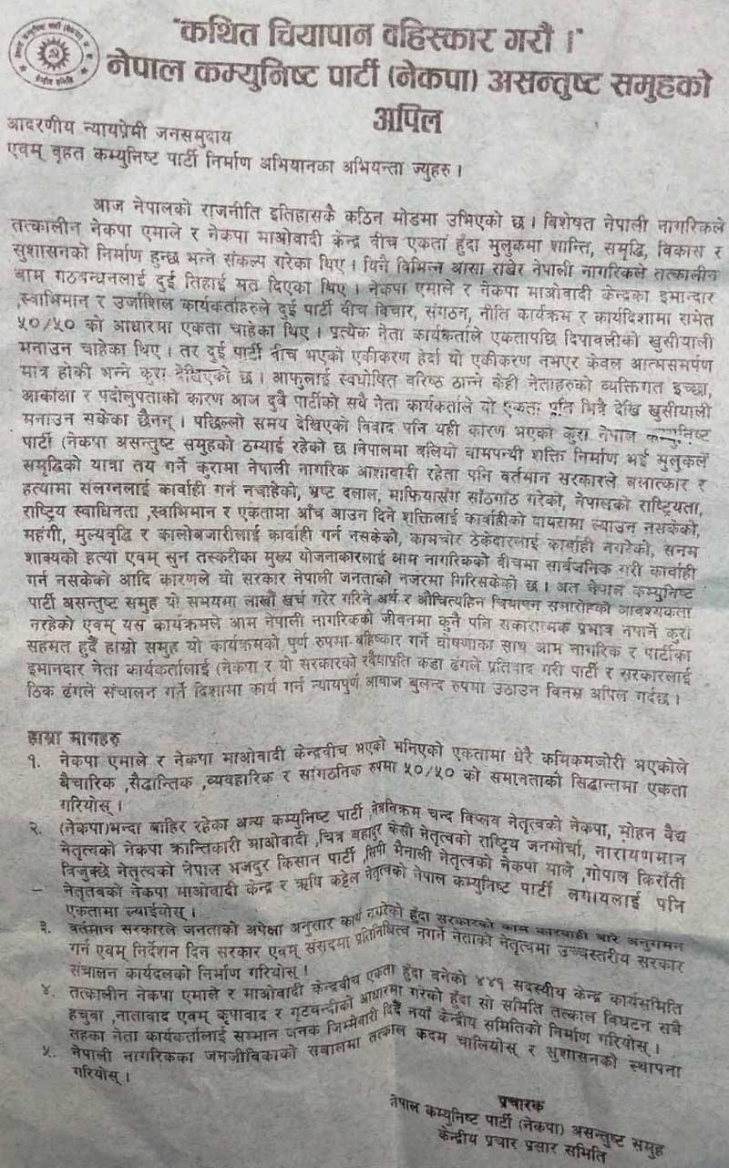 समानताको आधारमा एकता गरिनुपर्ने, विप्लव, मोहन वैद्य, चित्रबहादुर केसीलगायतका कम्युनिष्ट पार्टीलाई पनि एकतामा ल्याइनुपर्ने, तत्कालीन नेकपा माओवादीको तर्फबाट नातावाद र कृपावादका आधारमा नेकपाको केन्द्रीय सदस्य बनेकाले त्यसलाई विघटन गरेर नयाँ केन्द्रीय समिति बनाइनुपर्ने, नागरिकको जनजिविकाको सवालमा पार्टीले तत्काल पहलकदमी लिनुपर्नेलगायतका माग पर्चामा राखिएका छन् ।