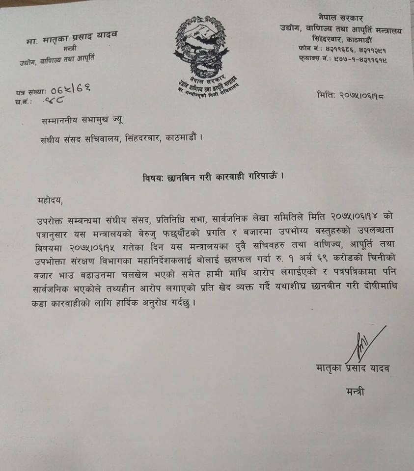 मन्त्री यादवले सभामुख कृष्णबहादुर महरालाई पत्र लेखेर चिनीको मूल्यवृद्धि बोल्ने सांसदहरूलाई कारबाहीको माग गरेका हुन् ।