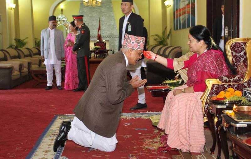 दशैँको टीका प्रदान गर्ने बेलाको यो तस्बिरलाई लिएर विभिन्न टिकाटिप्पणी भइरहेका बेला राष्ट्रपति कार्यालय मौन छ ।