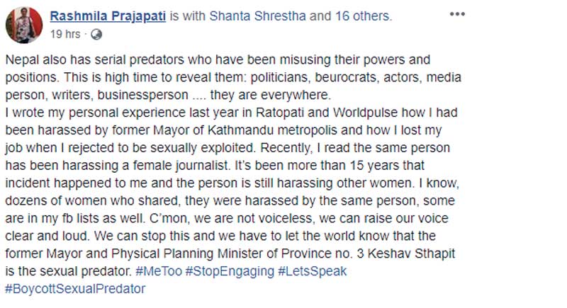 ‘१५ वर्ष भयो त्यो घटना घटेको तर पनि उक्त व्यक्तिबाट नै अन्य महिलाहरू ह्यारेस भएको कुरा मैले पढेकी छु । उनी अझै महिलाहरूलाई ह्यारेस गरिरहेका छन् । मलाई थाह छ, दर्जनभन्दा बढी महिलाहरूलाई उनले ह्यारेस गरेका छन् कति त मेरो फेसबुकको लिस्टमा पनि छन् । हामी बोल्न नसक्ने होइनौं । हामी हाम्रो आवाज उठाउन सक्छौं । हामी संसारलाई चिनाउन चाहन्छौं कि भौतिक योजना तथा निर्माण मन्त्री केशव स्थापित सेक्सुअल प्रेडेटर हो’, पत्रकार प्रजापतीले लेखेकी छिन् ।