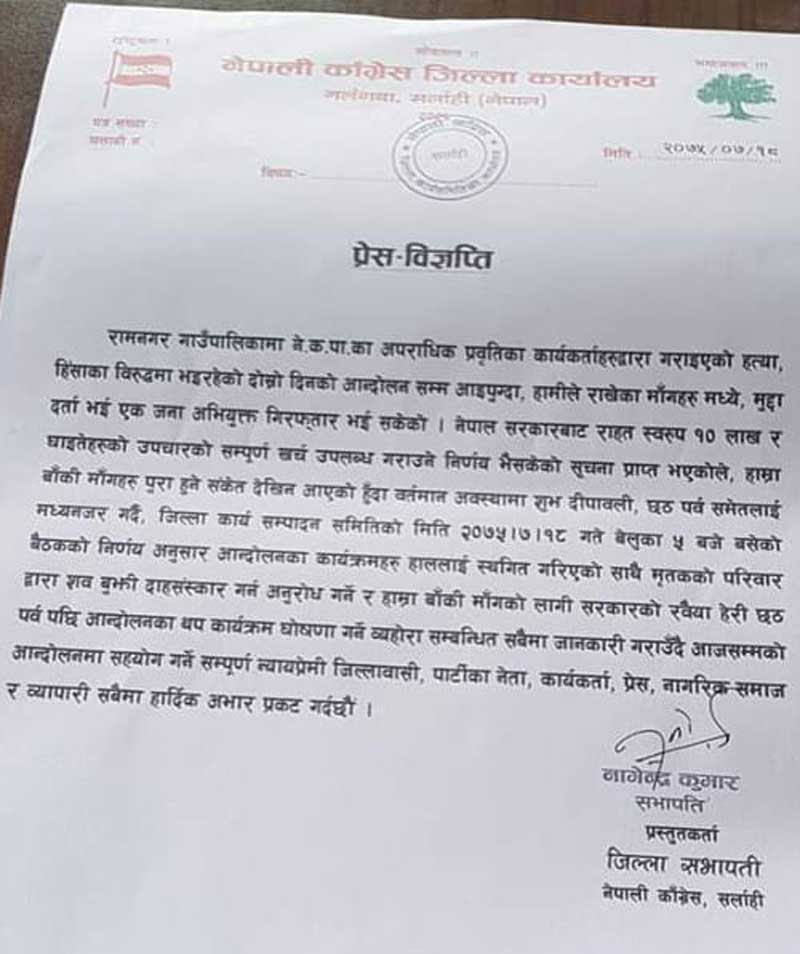 कम्युनिस्ट सरकारले गोली हानी हत्या गरिएका कांग्रेसका कार्यकर्ता रामविलास महतोका आफन्तलाई दश लाख दिने, घाइतेको उपचार खर्च उपलब्ध गराउन तयार भएको जानकारी कांग्रेस सर्लाहीलाई दिएपछि सबै कार्यक्रम छठसम्मका लागि स्थगित गरिएको आइतबार जारी प्रेस विज्ञप्तिमा उल्लेख छ ।