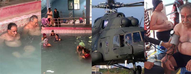 सेनाको हेलिकप्टर चढेर पत्नीसहित नुहाउन पुगे प्रचण्ड–बादल