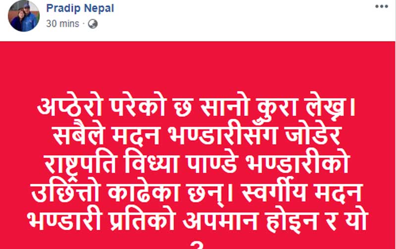 ‘अप्ठेरो परेको छ सानो कुरा लेख्न । सबैले मदन भण्डारीसँग जोडेर राष्ट्रपति विध्या पाण्डे भण्डारीको उछित्तो काढेका छन्’, नेता नेपालले फेसबुकमा लेखेका छन्, ‘स्वर्गीय मदन भण्डारीप्रतिको अपमान होइन र यो ?’