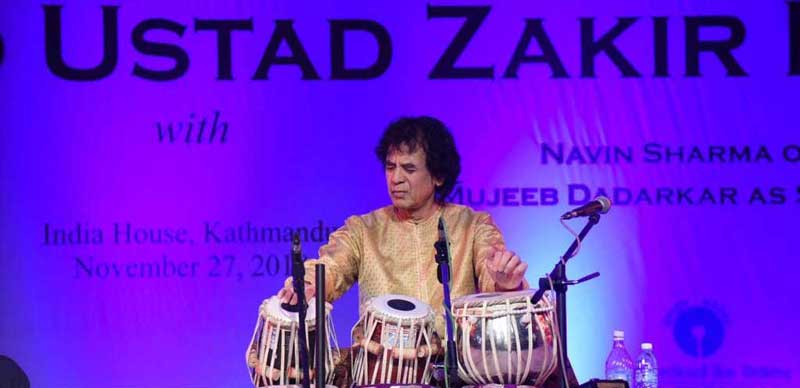 नेपालका लागि भारतीय राजदूतावासले नेपाल–भारतसम्बन्ध ७० वर्ष पुगेको अवसरमा आयोजना गरेको सांकृतिक कार्यक्रममा मंगलबार साँझ काठमाडौंको लैनचौरस्थित भारतीय राजदूतावासको इण्डिया हाउसमा जाकिर हुसेनले झण्डै साढे दुई घण्टा प्रस्तुति दिएका हुन् ।