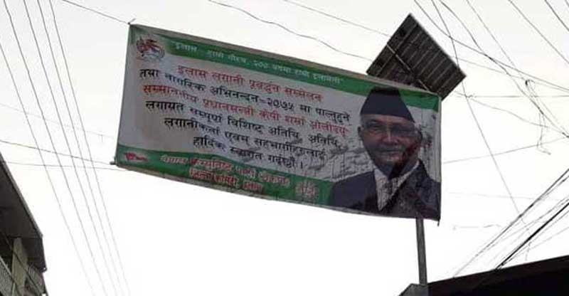 कार्यक्रमको प्रचारका लागि टाँगिएका पर्चामा प्रधानमन्त्री ओलीको तस्वीरमा राति नै कालो पोतिएको छ ।