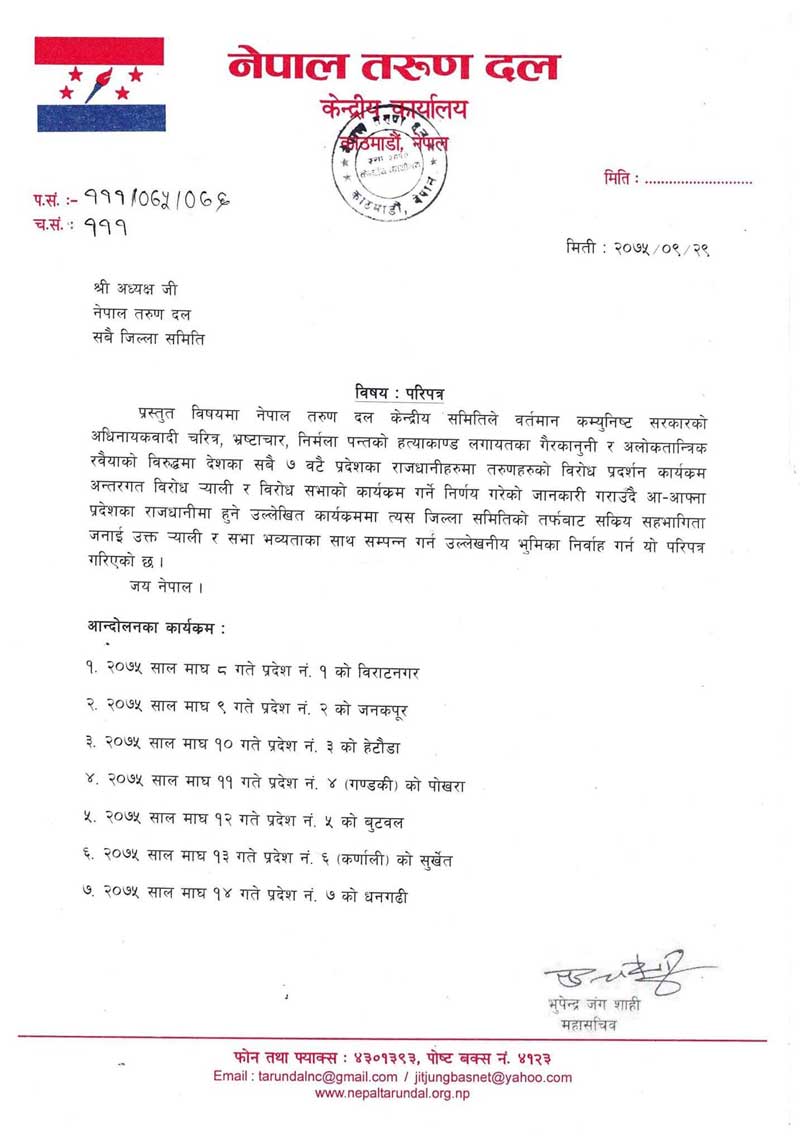 नेपाली कांग्रेसका मुख्यसचिव कृष्णप्रसाद पौडेलले माघ ३ गते ७७ जिल्लाका सभापतिहरूलाई परिपत्र गरेर नेपाल तरुण दलको विरोध सभा र विरोध र्यालीहरूलाई सहयोग र समन्वय गर्न सभापति शेरबहादुर देउवाको निर्देशानुसार परिपत्र गरेका हुन् ।