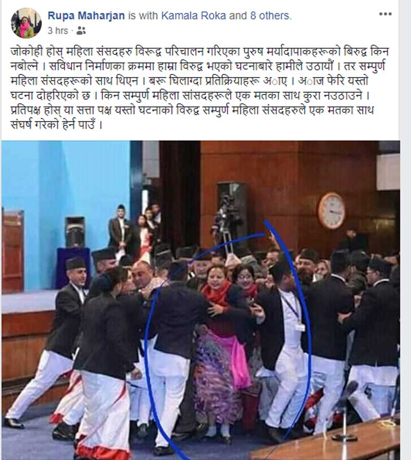 तर, कांग्रेसले पूर्वजानकारी दिँदा दिँदै सभामुख महराले आफू खुसी संसद चलाउँदै गए । त्यति मात्रै होइन सभामुख महराले संसद अवरोध गर्न पुगेका नेपाली कांग्रेसका महिला सांसदहरूलाई पुरुष मर्यादापालक (सुरक्षाकर्मी) लगाएर रोकेका छन् । पुरुष मर्यादापालकहरूले कांग्रेसका महिला सांसदहरूलाई रोक्ने क्रममा जहाँ मन लाग्यो त्यहीँ छोएको आरोप लागेको छ ।