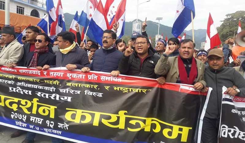 बुटवलमा नेपाल तरुण दलले कम्युनिस्ट सरकारविरुद्ध आयोजना गरेको विरोध सभालाई सम्बोधन गर्दै अध्यक्ष बस्नेतले मेलम्ची खानेपानीको ठेकेदारसँग मन्त्री बिना मगरले पाँच करोड घुस लिएको बताए ।