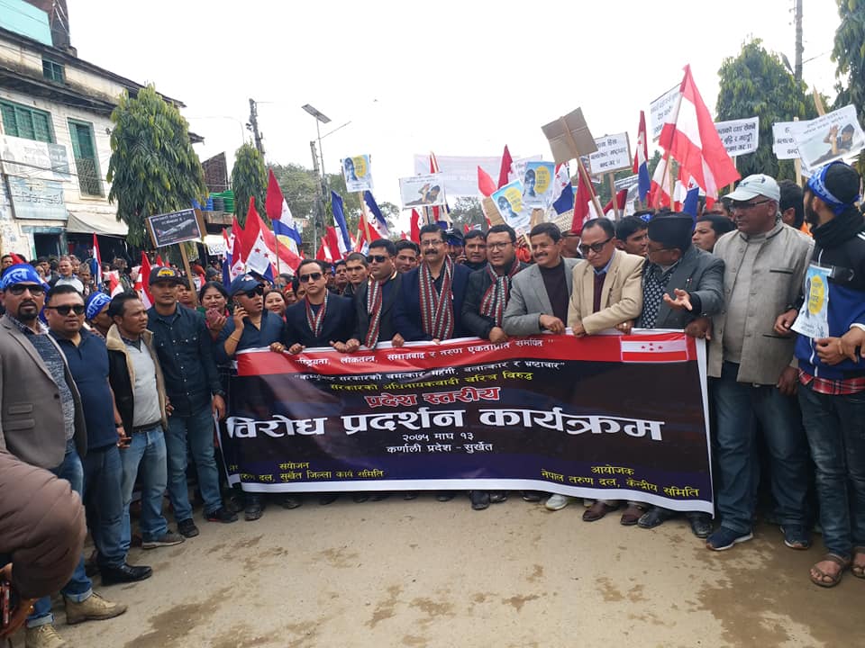 वीरेन्द्रनगर । नेपाल तरुण दलले कम्युनिस्ट सरकारको अधिनायकवाविरुद्ध सुर्खेतको वीरेन्द्रनगर नगरपालिकामा आइतबार भव्य विरोध र्याली र विरोध सभा गरेको छ ।