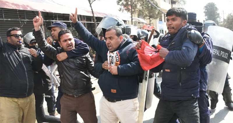 ओली बस्ने घरकै छेउमा नेविसंघको प्रदर्शन, प्रहरीको धरपकड र दमन
