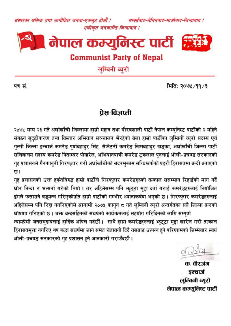 विप्लवको नेकपाले फागुन ८ गते लुम्बिनी बन्दको आव्हान गरेको जारी विज्ञप्तिमा उल्लेख छ । नेकपाको लुम्बिनी ब्युरो इञ्चार्ज वीरजंगद्वारा जारी विज्ञप्तिमा कम्युनिस्ट सरकारको धरपकड, गिरफ्तारी र दमनका बिरुद्ध बन्द आह्वान गरेको जनाइएको छ ।