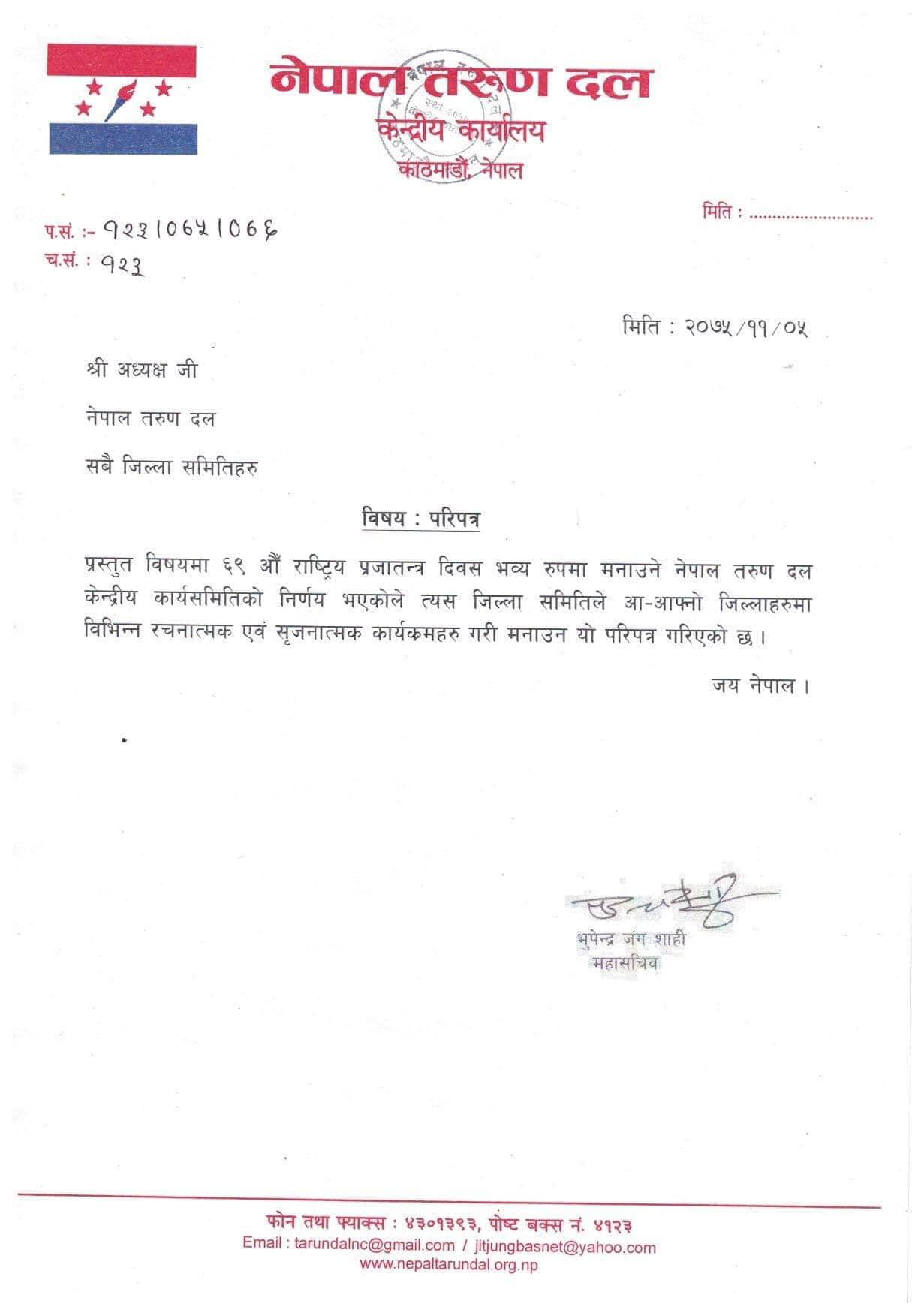 फागुन ७ गते प्रजातन्त्र दिवस मनाउन तरुण दलको परिपत्र