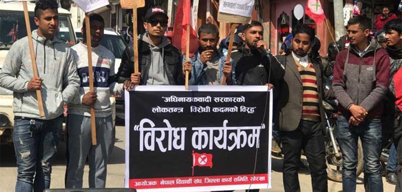 नेविसंघ गोरखाले बुधबार कम्युनिस्ट सरकारविरुद्ध विरोध प्रदर्शन गरेको हो । गोरखा सदरमुकामस्थित हरमटारीमा गायक शर्मा गीत बजाएर प्रदर्शन गरेको नेविसंघले जनाएको छ ।