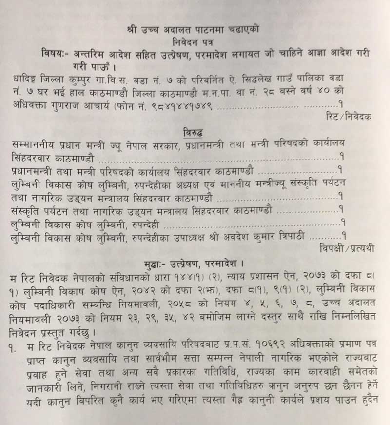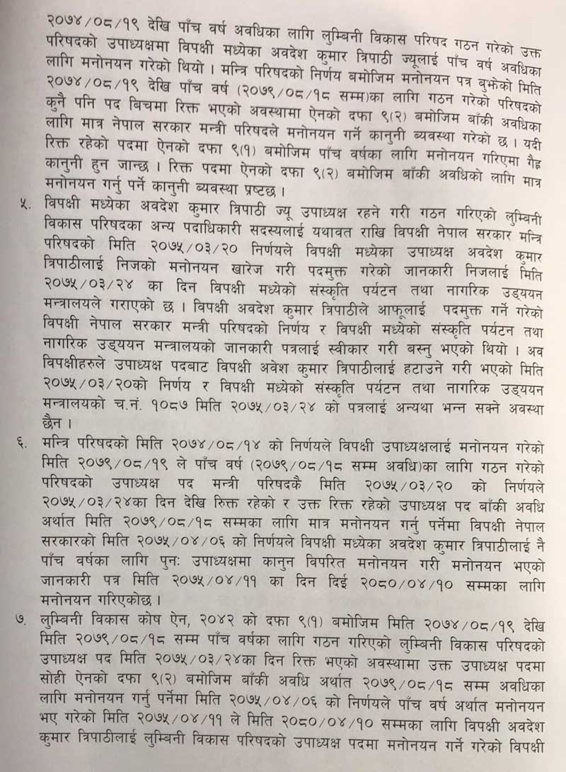‘गैह्र कानूनी कार्यले कुनै पनि अवस्थामा प्रसय पाउनु हुँदैन र कानून विपरीत कुनै पनि कार्य गर्नु गराउनु हुँदैन’, अधिवक्ता आचार्यले रिटमा लेखेका छन्, ‘विपक्षीमध्येका अवदेशकुमार त्रिपाठीलाई उपाध्यक्षमा मनोनयन गर्ने नेपाल सरकार मन्त्रिपरिषदको मिति २०७५–०४–०६ को निर्णय विपक्षी अवदेशकुमार त्रिपाठीलाई मनोनय गर्ने गरेको संस्कृति, पर्यटन तथा नागरिक उड्डयन मन्त्रालयको मिति २०७५–०४–११ को च.नं. ४५ को पत्र समेत लुम्बिनी विकास कोष ऐन, २०४२ को दफा ९ (२) विपरीत भएको र कानून विपरीत मनोनय भएको व्यक्तिलाई पदमा रही कामकाज गरी रन दिन कानूनी त्रुटि हुने भएकाले सुविधा र सन्तुलनका आधारमा विपक्षी अवदेशकुमार त्रिपाठीलाई उपाध्यक्षको हैसियतबाट कुनै कार्य नगर्नु नगराउनु भन्ने विपक्षीहरूका नाममा उच्च अदालत नियमावली २०७३ को नियम ४२ बमोजिम अन्तरिम आदेश जारी गरी पाउँ भनिएको छ ।’