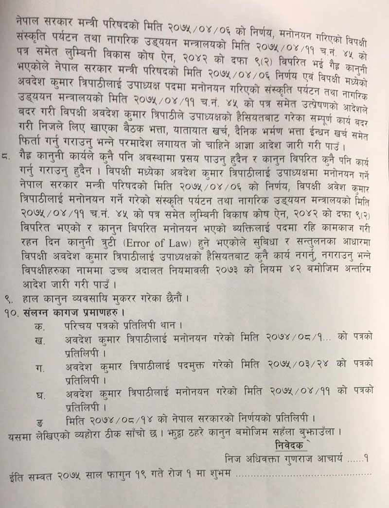 ‘नेपाल सरकार मन्त्रिपरिषदको मिति २०५७–०४–०६ को निर्णय, मनोनयन गरिएको विपक्षी संस्कृति, पर्यटन तथा नागरिक उड्डयन मन्त्रालयको मिति २०७५–०४–११ च.नं. ४५ पत्र समेत लुम्बिनी विकास कोष ऐन, २०४२ को दफा ९ (२) विपरीत भई गैह्र कानूनी भएकोले नेपाल सरकार मन्त्रिपरिषदको मिति २०७५–०४–०६ निर्णय एवम् विपक्षी मध्येको अवदेशकुमार त्रिपाठीलाई उपाध्यक्ष पदमा मनोनयन गरिएको संस्कृति पर्यटन तथा नागरिक उड्डयन मन्त्रालयको मिति २०७५–०४–११ च.नं. ४५ को पत्र समेत उत्प्रेषणको आदेशले बदर गरी विपक्षी अवदेशकुमार त्रिपाठीले उपाध्यक्षको हैसियतबाट गरेका सम्पूर्ण कार्य बदर गरी निजले लिएको खाएका बैठक भत्ता, यातायात खर्च, दैनिक भ्रमण भत्ता, इन्धन खर्च समेत फिर्ता गर्नु गराउनु भन्ने परमादेश लगायत जो चाहिने आज्ञा आदेश जारी गरी पाउँ’, रिटमा उल्लेख छ ।