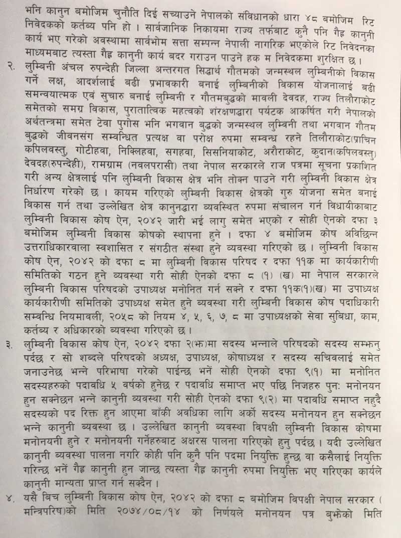 ‘गैह्र कानूनी कार्यले कुनै पनि अवस्थामा प्रसय पाउनु हुँदैन र कानून विपरीत कुनै पनि कार्य गर्नु गराउनु हुँदैन’, अधिवक्ता आचार्यले रिटमा लेखेका छन्, ‘विपक्षीमध्येका अवदेशकुमार त्रिपाठीलाई उपाध्यक्षमा मनोनयन गर्ने नेपाल सरकार मन्त्रिपरिषदको मिति २०७५–०४–०६ को निर्णय विपक्षी अवदेशकुमार त्रिपाठीलाई मनोनय गर्ने गरेको संस्कृति, पर्यटन तथा नागरिक उड्डयन मन्त्रालयको मिति २०७५–०४–११ को च.नं. ४५ को पत्र समेत लुम्बिनी विकास कोष ऐन, २०४२ को दफा ९ (२) विपरीत भएको र कानून विपरीत मनोनय भएको व्यक्तिलाई पदमा रही कामकाज गरी रन दिन कानूनी त्रुटि हुने भएकाले सुविधा र सन्तुलनका आधारमा विपक्षी अवदेशकुमार त्रिपाठीलाई उपाध्यक्षको हैसियतबाट कुनै कार्य नगर्नु नगराउनु भन्ने विपक्षीहरूका नाममा उच्च अदालत नियमावली २०७३ को नियम ४२ बमोजिम अन्तरिम आदेश जारी गरी पाउँ भनिएको छ ।’