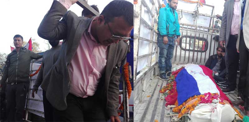 बुटवल । नेपाल तरुण दलका महासचिव भुपेन्द्रजंग शाहीले रुपन्देही देवदहमा हत्या गरिएका तरुण दलका सक्रिय कार्यकर्ता अनिश पुरीको शवमा झण्डा ओडाएर श्रद्धाञ्जलि दिएका छन् ।