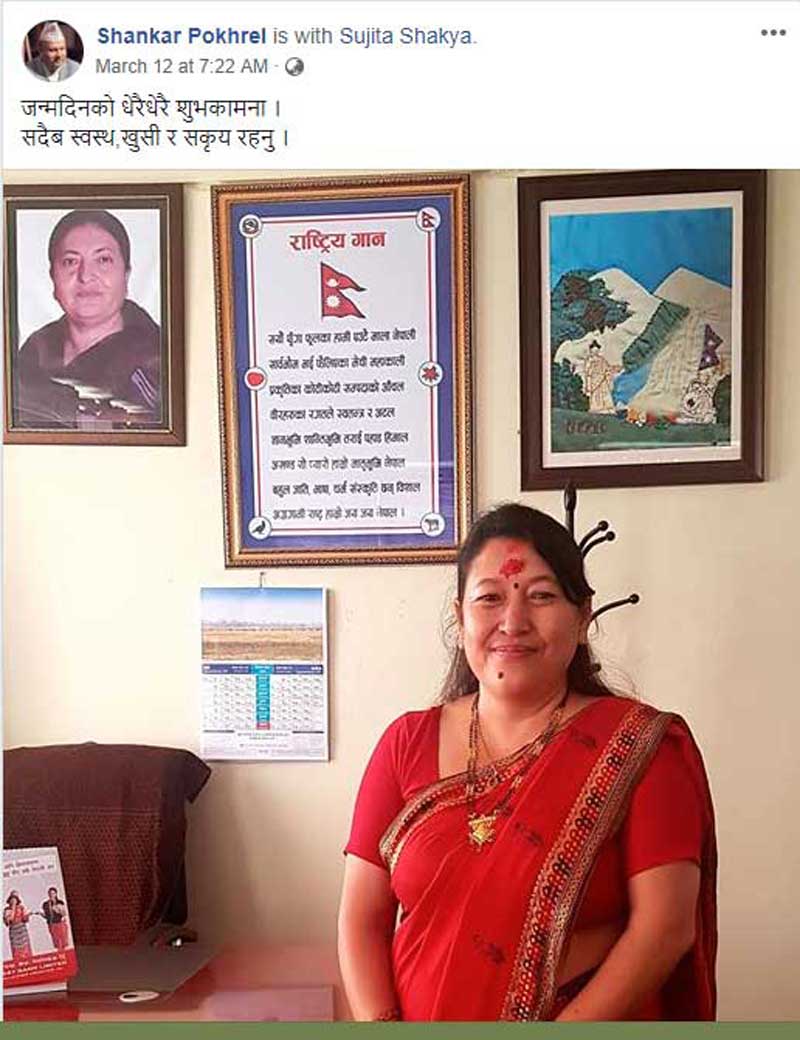 मुख्यमन्त्री पोखरेलकी पत्नी शाक्यले आफूले जन्मोत्सव मनाउँदा पाउँदा समृद्ध नेपाली बन्ने बताएकी छिन् । उनको स्टाटसले त्यही संकेत गरेको छ ।