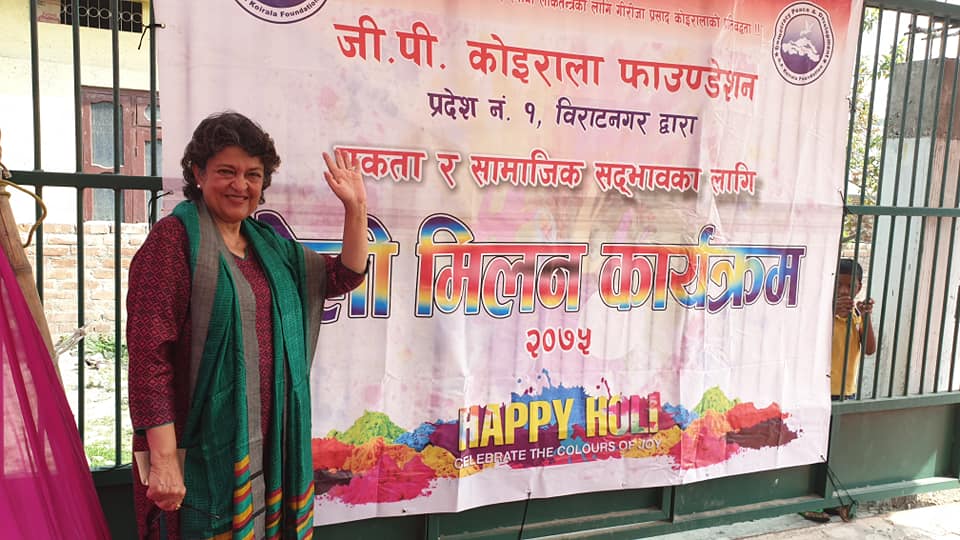 जीपी फाउण्डेसनले मोरङको विराटनगरमा बुधबार आयोजना गरेको होली मिलन कार्यक्रममा सहभागी भएर नेतृ कोइरालाले होली पर्व मनाएकी हुन् । कोइरालाले नेपाली कांग्रेसका नेता तथा कार्यकर्ताहरूलाई रंग, अविर लगाइदिएकी थिइन् ।