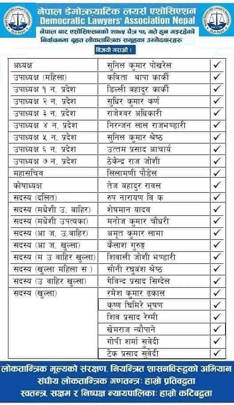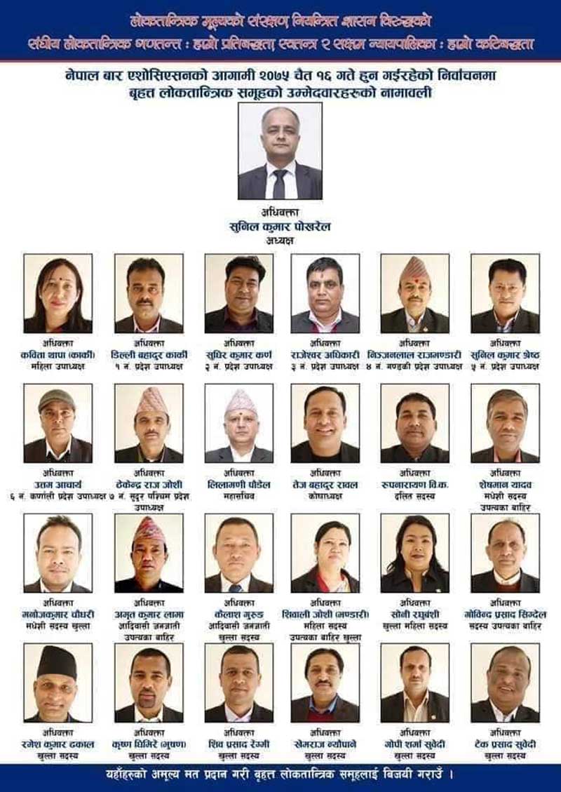 ‘देशभरिका मतदाता र कानून व्यवसायीलाई वृहत लोकतान्त्रिक समूहलाई विजयी गराउन अपील छ’, उनले भने, ‘नियन्त्रित शासन व्यवस्थाको विपक्षमा रहेको लोकतान्त्रिक समूह विजयी हुने छौँ ।’