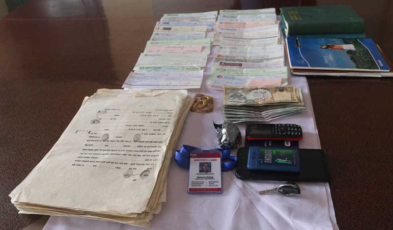 पक्राउ परेका धितालको चेक रकम १ करोड ६९ लाख, ८२ थान चेक, २ वटा खाली चेक, ३२ वटा तमसुक, तमसुक रकम १ करोड २४ लाख, ४ वटा ढुकुटी खेलाउने रजिष्टर, थप ४ वटा खाली तमसुक, एक थान जलजला अनलाइनको पत्रकार परिचय पत्र, २ थान मोवाइल, १८ हजार ५ सय नगद, २ वटा सुनको औंठी, १ थान ब्रासलेट, १ थान हाते घडी, बा १५ च ७६६८ नम्बरको गाडी र भे ८ प ३९५५ नम्बरको स्कुटी समेत बरामद भएको एसपी पाण्डेले पत्रकार सम्मेलनमा जानकारी दिए ।