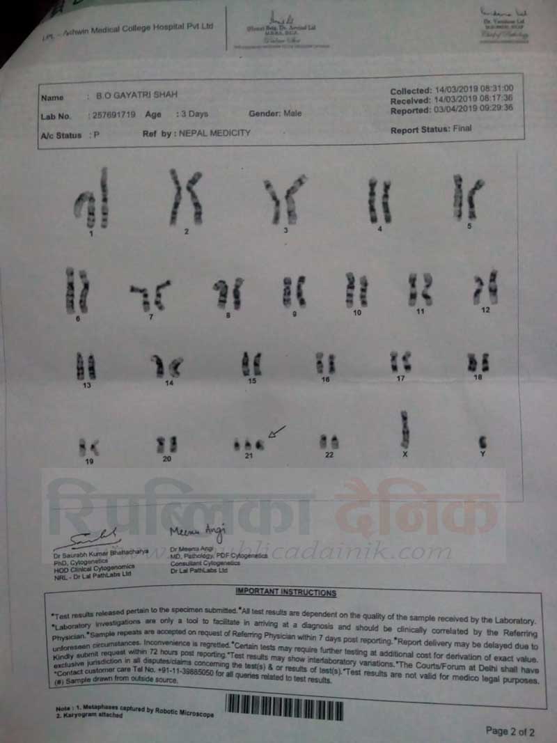 डा.श्रेष्ठले ‘डाउन सिन्ड्रम’को रुटिन टेष्ट गर्ने प्रोटकल र सुविधा नेपालमा नरहेको भन्दै पन्छिन खोजेकी छिन् । उनले भिडियो एक्सरेबाट मात्रै ‘डाउन सिन्ड्रम’ भएको पत्ता लाग्न नसक्ने बताइन् ।