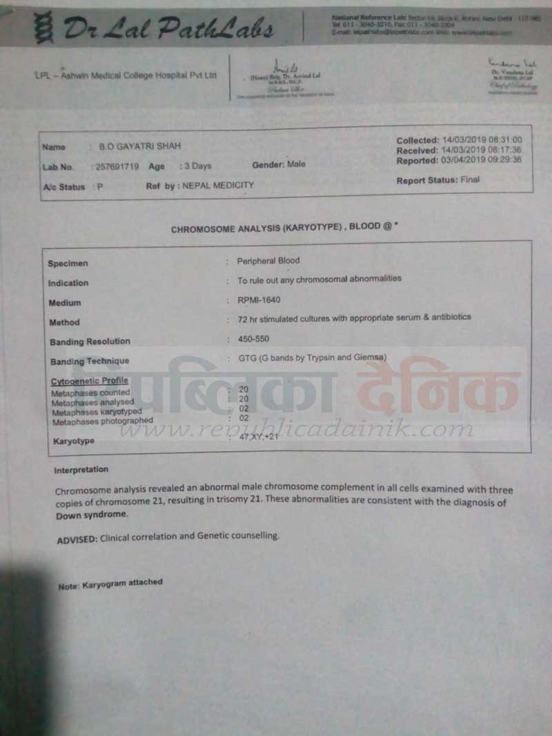गर्भवती जाँचका क्रममा मेडिसिटीले मोटो रकम कुम्ल्याए पनि गर्भभित्र रहेको बच्चामा ‘डाउन सिन्ड्रम’ भएकोमा डा.श्रेष्ठले कुनै ज्ञान नराखेको आरोप राजेश महतोको छ ।