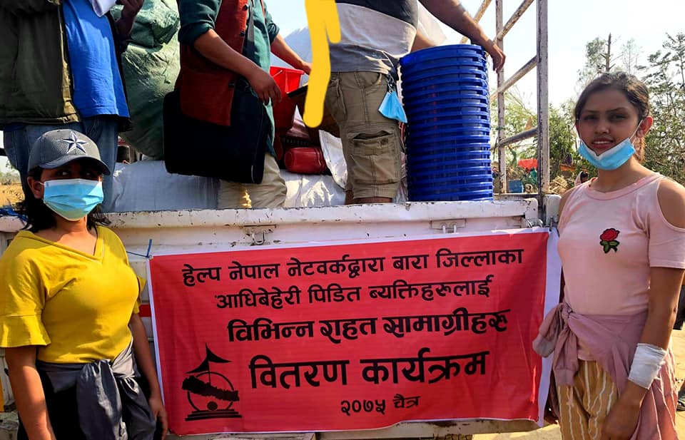 हेल्प नेपाल नेटवर्कले चैत २० गते प्राकृतिक प्रकोपमा परेको बारा जिल्लाको खुटुवामा राहत सामाग्री बितरण गरेको हो । आफ्ना सहयोगीहरूसहित आएकी भावना राउतसहितका स्वयं सेवकहरूले पीडितहरूलाई दैनिक उपभोग्य सामाग्रीहरू वितरण गरेको थियो ।