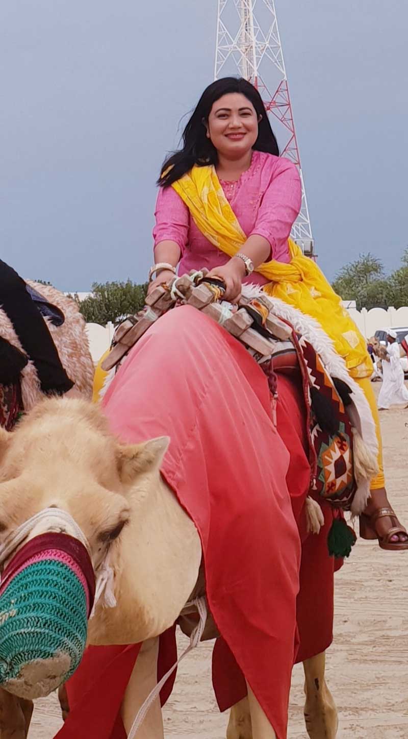 तस्वीरसँग नेतृ चौधरीले ‘घोडा चढ्ने लड्छन अरे, उठ्दै अघि बढ्छन अरे, मनमा आँट हुनेहरू अग्लो शिखर चढ्छन अरे, तर उँट चढेको हो है’, भनेर स्टास लेखेकी छिन् ।