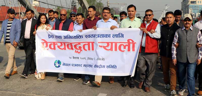 काठमाडौं । समाचार लेखेकै भरमा पत्रकारहरूले जेल परिरहेका बेला नेपाल पत्रकार महासंघले प्रेस तथा अभिव्यक्ति स्वन्त्रताका लागि ऐक्यवद्धता र्याली निकालेको छ ।