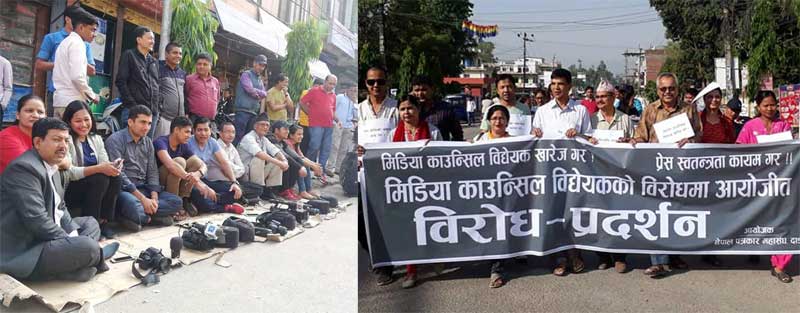 उनीहरूले विधेयकमा राखिएका प्रावधानले प्रेस स्वतन्त्रता कुण्ठित गरेको भन्दै विरोधमा शुक्रबार देशभरि सडकमा उत्रिएका हुन् । काठमाडौंमा संसद भवन नजिकै पत्रकारहरूले प्रदर्शन र धर्ना दिएका छन् ।