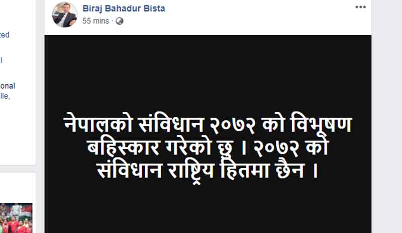 विष्टले ०७२ सालको संविधान राष्ट्रिय हितमा नरहेको भन्दै विभूषण बहिस्कार गर्नु परेको बताएका छन् । ‘नेपालको संविधान ०७२ को विभूषण बहिस्कार गरेको छु’, उनले भनेका छन्, ‘०७२ को संविधान राष्ट्रिय हितमा छैन ।’