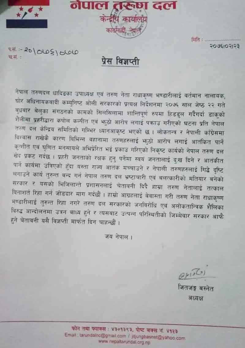 ‘नेपाल तरुण दल धादिङका उपाध्यक्ष एवम् तरुण दलका युवा नेता राधाकृष्ण भण्डारीलाई वर्तमान नालायक, घोर अधिनायकवादी कम्युनिस्ट ओली सरकारको प्रत्यक्ष निर्देशनमा जेठ २२ गते बुधबार बेलुका संगठनको कामको सिलसिलामा शान्तिपूर्ण हिँडडुल गर्दैगर्दा डाकुको शैलीमा प्रहरीद्वारा कपोलकल्पीत एवम् झुठो आरोप लगाई पक्राउ गरिएको घटनाप्रति नेपाल तरुण दल केन्द्रीय समितिको गम्भीर ध्यानआकृष्ट भएको छ’, विज्ञप्तिमा भनिएको छ ।
