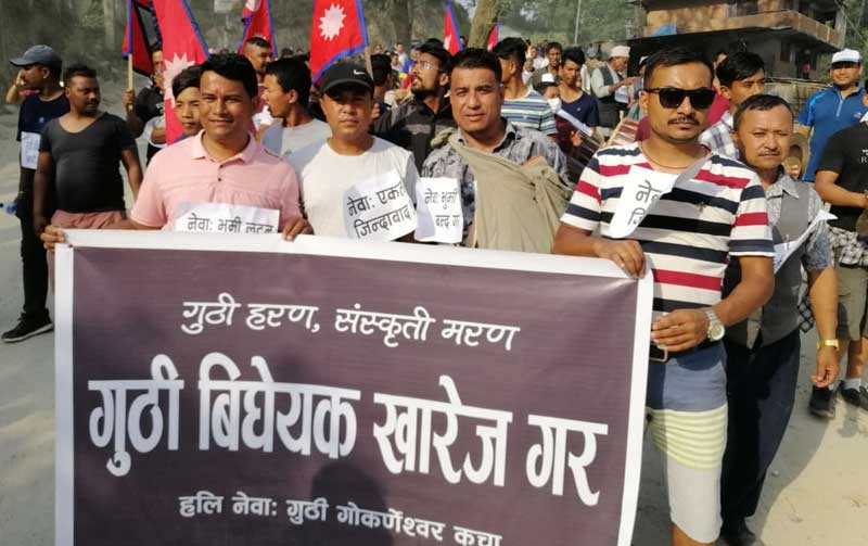 काठमाडौं । कम्युनिस्ट सरकारले ल्याएको गुठी विधेयकविरुद्ध काठमाडौं उपत्यकाभित्र आन्दोलन चर्किएका बेला गोकर्णेश्वर नगरपालिकाका स्थानीयले पनि गुठी विधेयकको विरोध गरेका छन् ।
