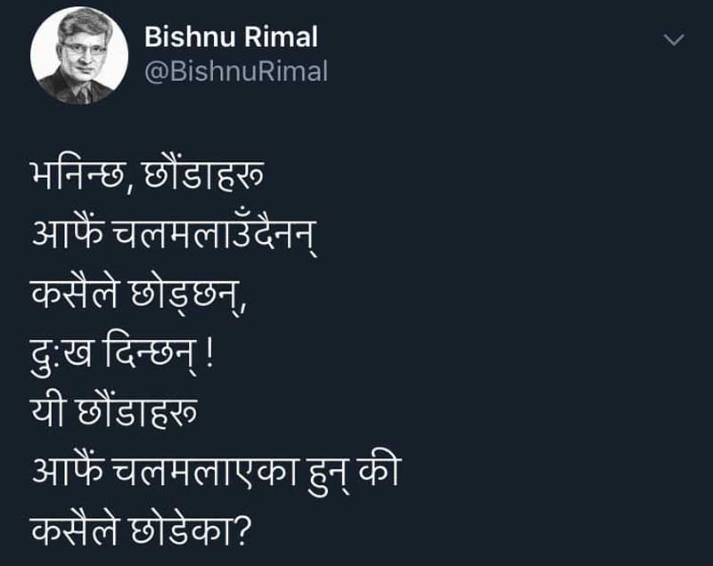 ओली सरकारलाई चौतर्फी आक्रमण भइरहेका बेला सल्लाहकार रिमालले बचाउ गर्दै बेलाबेला उट्पट्याङ ट्वीट गर्ने गरेका छन् ।