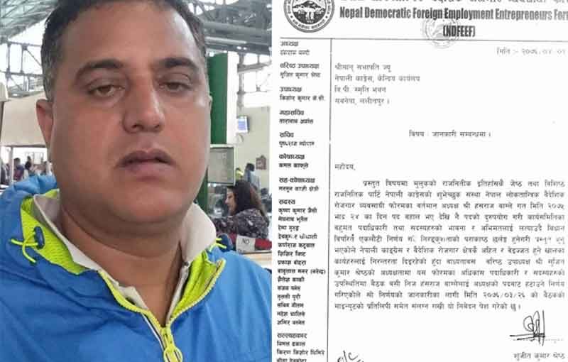 ‘वर्तमान अध्यक्ष हंसराज वाग्ले गत ०७५ भदौ २४ गतेका दिन पद वहाल भएदेखि नै पदको दुरुपयोग गरी कार्यसमितिका बहुमत पदाधिकारी तथा सदस्यहरूको भवना र अभिमतलाई लत्याउँदै विधान विपरित एकलौटी निर्णय गर्दै निरंकुशताको पराकाष्ठा छलंङग हुने गरी प्रस्तुत हुनु भएकाले नेपाली कांग्रेस र वैदेशिक रोजगार क्षेत्रकै अहित र वेइज्जत हुने खालका कार्यहरूलाई निरन्तरता दिइरहेको हुँदा वाध्यतावस वरिष्ठ उपाध्यक्ष सुजितकुमार श्रेष्ठको अध्यक्षतामा यस फोरमका अधिकांश पदाधिकारी र सदस्यहरूको उपस्थितिमा बैठक बसी निज हंसराज वाग्लेलाई अध्यक्ष पदबाट हटाउने निर्णय गरिएकोले सो निर्णयको जानकारीका लागि असार २६ गतेको बैठकको निर्णय प्रतिलितपी समेत राखेर निवेदन पेश गरिएको छ’, सभापति देउवालाई सम्बोधन गरेर पार्टी मुख्यालय सानेपामा दर्ता भएको पत्रमा उल्लेख छ ।