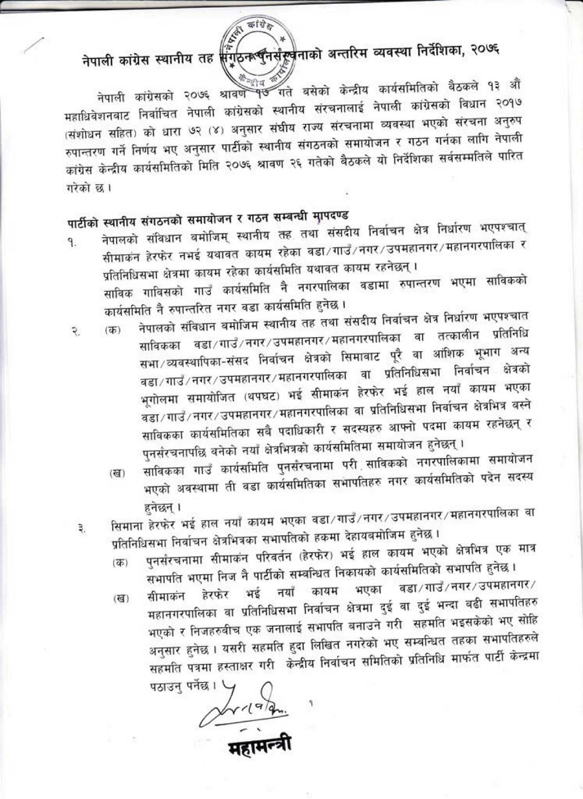 ‘नेपाली कांग्रेसको विधान २०१७ (संशोधन सहित) को धारा ७२ (४) अनुसार संघीय राज्य संरचनामा व्यवस्था भएको संरचना अनुरुप रुपान्तरण गर्ने निर्णय भए अनुसार पार्टीको स्थानीय संगठनको समायोजन र गठन गर्नका लागि नेपाली कांग्रेस केन्द्रीय कार्यसमितिको मिति ०७६ साउन २६ गतेको बैठकले यो निर्देशिका सर्वसम्मतिले पारित गरेको छ’, निर्देशिकामा उल्लेख छ ।