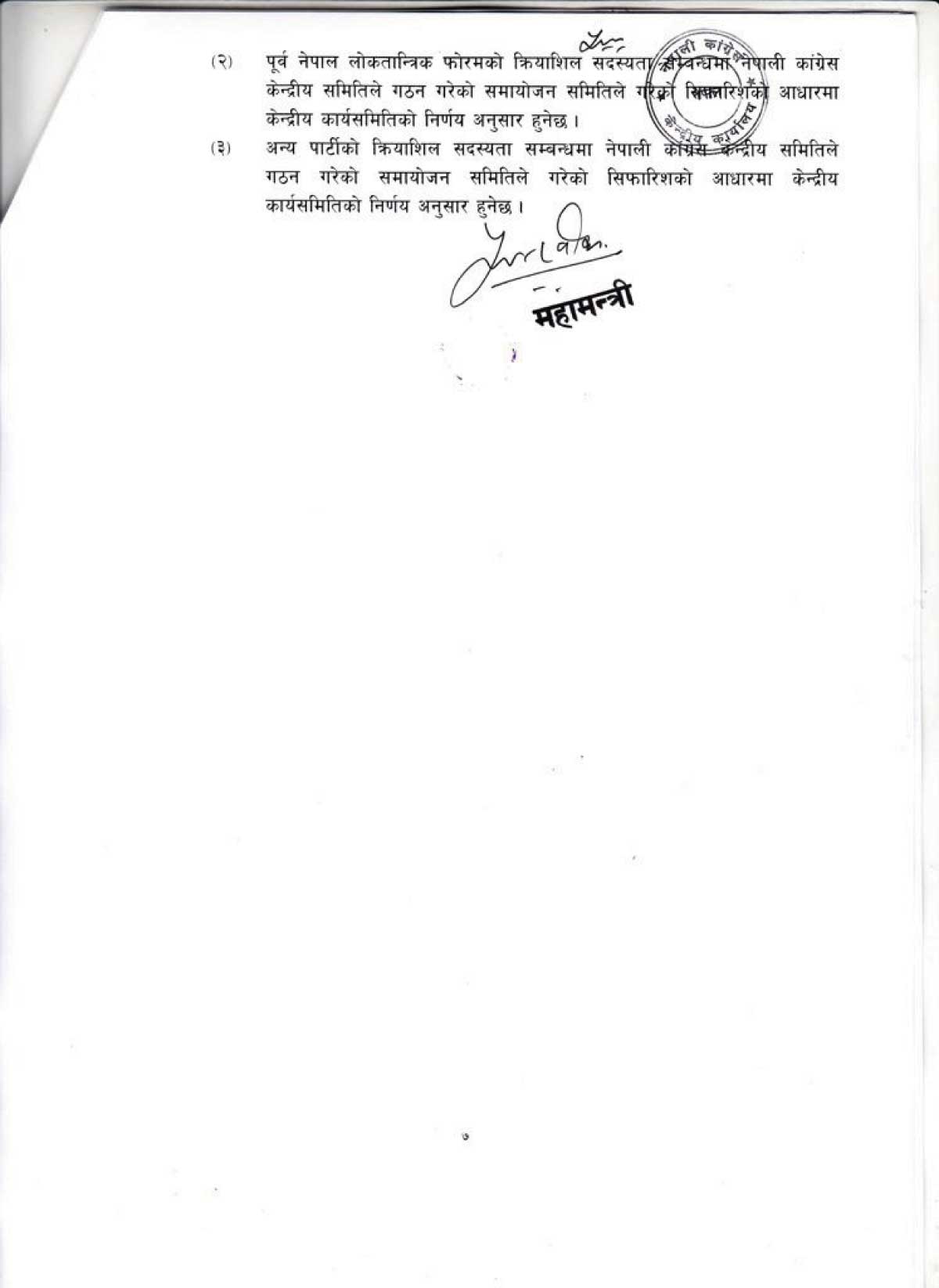 नेपाली कांग्रेसको स्थानीय संरचनाहरूमा समायोजनबारे समायोजन समितिले गरेको सिफारिशको आधारमा केन्द्रीय कार्यसमितिको निर्णय अनुसार स्थानीय संगठनमा समायोजन गर्ने उल्लेख गरिएको छ ।
