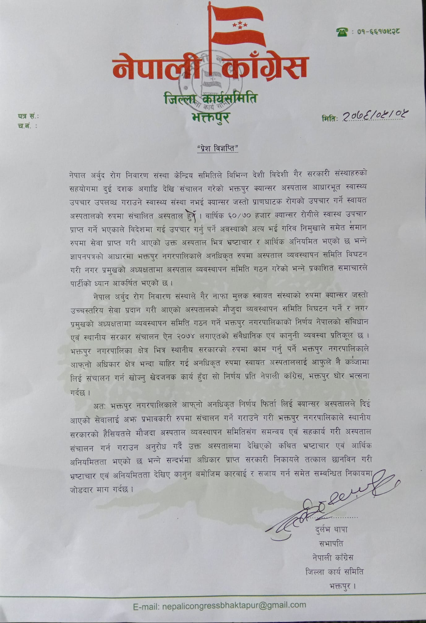 पार्टी सभापति दुर्लभ थापाले विहीबार पत्रकार सम्मेलन गरेर भक्तपुर क्यान्सर अस्पतालमा भक्तपुर नगरपालिकाले हस्तक्षेप गरेको भन्दै आक्रोश जनाए । सभापति थापाले नेमकिपाले अनावश्यक हस्तक्षेप गरेको भन्दै सो कार्य रोक्न चेतावनी दिए ।