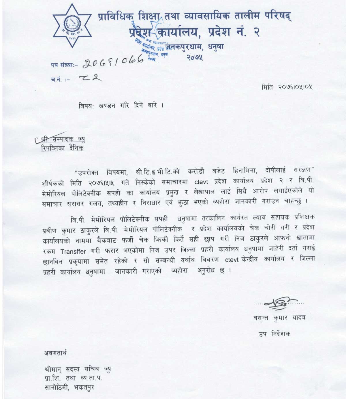 ‘वीपी मेमोरियल पोलिटेक्निक सपही धनुषामा तत्कालीन कार्यरत ल्याब सहायक प्रशिक्षक प्रवीणकुमार ठाकुरले वीपी मेमोरियल पोलिटेक्निक र प्रदेश कार्यालयको चेक चोरी गरी र प्रदेश कार्यालयको नाममा बैंकबाट फर्जी चेक झिकी कीर्ते सहिछाप गरी निज ठाकुरले आफ्नो खातामा रकम ट्रान्सफर गरी फरार भएकोमा निज उपर जिल्ला प्रहरी कार्यालय धनुषामा जाहेरी दर्ता गराई छानविन प्रकृया समेत रहेको र सो सम्बन्धी यथार्थ विवरण सीटीईभीटी केन्द्रीय कार्यालय र जिल्ला प्रहरी कार्यालय धनुषामा जानकारी गराएको छु’, खण्डनमा भनिएको छ ।